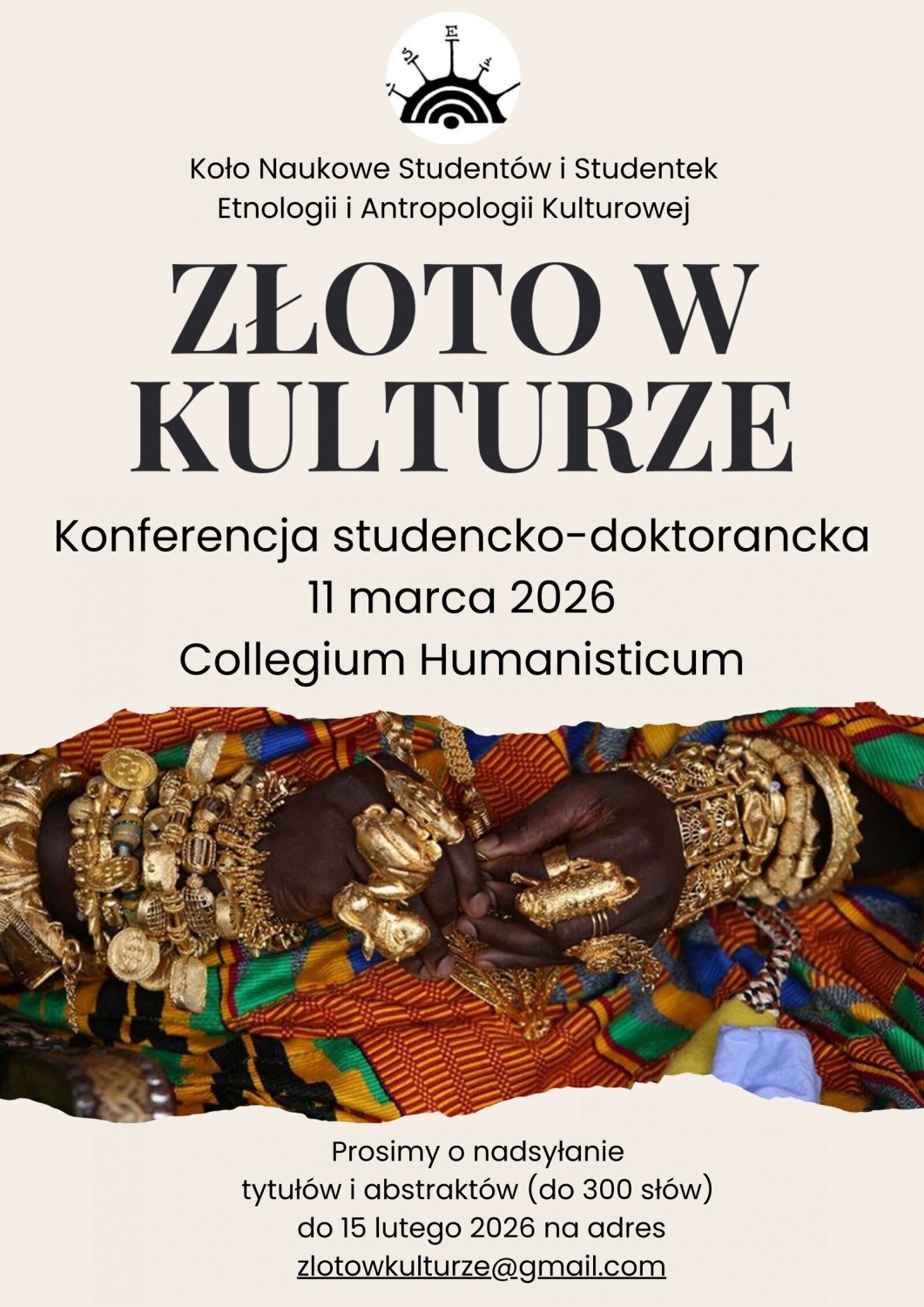 Koło Naukowe Studentów i Studentek Etnologii i Antropologii Kulturowej UMK, zaprasza na studencko-doktorancką konferencję naukową “Złoto w kulturze”, która związana jest z wydaniem dziesiątego numeru zina etnograficznego “Nowe Okoliczności”. Jubileuszowy, złoty numer naszego czasopisma to okazja by zaprosić antropologów, kulturoznawców, socjologów, filologów, pedagogów, filozofów, politologów, medioznawców i wszystkich innych badaczy kultury i społeczeństwa do wspólnej refleksji nad znaczeniem złota jako metafory przemian wartości w kulturze polskiej i w innych kulturach. Konferencja odbędzie się 11 marca 2026 r. na Uniwersytecie Mikołaja Kopernika w Toruniu, zgłoszenia należy przesłać do 15 lutego 2026 r.