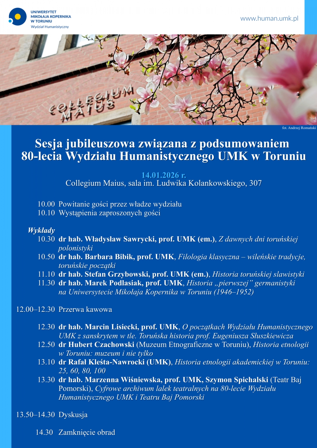 Serdecznie zapraszamy 14 stycznia 2026 r. (środa) o godz. 10.00 do Collegium Maius na jubileuszową sesję podsumowującą 80 lat Wydziału Humanistycznego UMK.