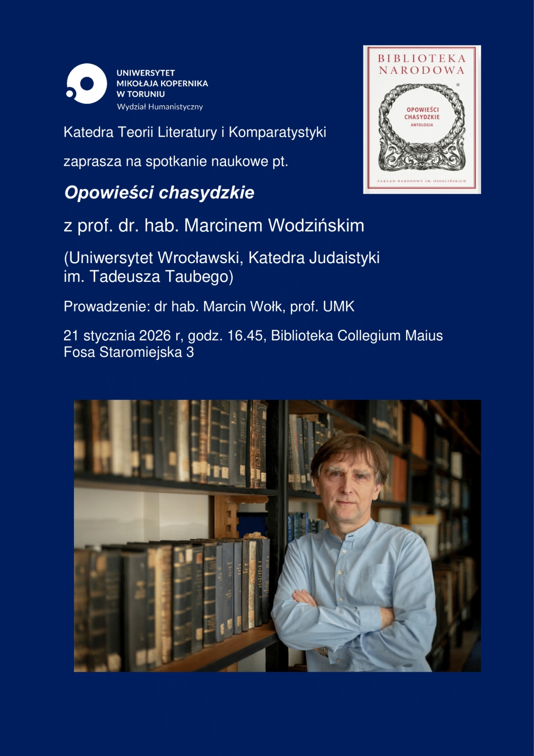 Prof. Marcin Wodziński jest judaistą, współtwórcą Katedry Judaistyki im. Tadeusza Taubego na Uniwersytecie Wrocławskim, autorem licznych prac, zwłaszcza na temat chasydyzmu. Są to m.in.: Hebrajskie inskrypcje na Śląsku XIII–XVIII w., Wrocław 1996, Groby cadyków w Polsce. O chasydzkiej literaturze nagrobnej i jej kontekstach, Wrocław 1998, Oświecenie żydowskie w Królestwie Polskim wobec chasydyzmu, Warszawa 2003, Źródła do dziejów chasydyzmu w Królestwie Polskim, 1815–1867, w zasobach polskich archiwów państwowych / Hasidism in the Kingdom of Poland, 1815–1867: Historical Sources in the Polish State Archives, Kraków–Budapest 2011, Historical Atlas of Hasidism, Princeton 2018 (wyd. pol.: Chasydyzm. Atlas historyczny, Kraków 2019), Hasidism. Key Questions, New York–Oxford 2018. W latach 2010–2012 prof. Wodziński był konsultantem historycznym wystawy stałej w Muzeum Historii Żydów Polskich POLIN w Warszawie. W roku 2025 w serii "Biblioteka Narodowa" ukazał się tom pt. Opowieści chasydzkie. Antologia w opracowaniu Marcina Wodzińskiego i Wojciecha Tworka. Książka ta będzie głównym tematem toruńskiego spotkania, na które złoży się wykład (przystępny również dla studentów) oraz część dyskusyjna.
