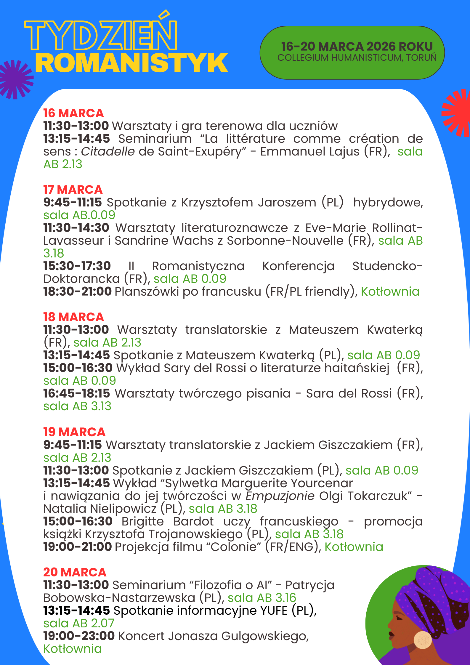 Koło Naukowe Excentrycy zaprasza na Tydzień Romanistyk w dniach 16-20 marca 2026. W tym roku będziemy gościć znakomitych tłumaczy literatury francuskiej i frankofońskiej: Krzysztofa Jarosza, Jacka Giszczaka i Mateusza Kwaterkę, a także specjalistkę od literatury haitańskiej, Sarę del Rossi, i dwie wykładowczynie z Sorbonne-Nouvelle. Program jest bogaty - każdy znajdzie coś dla siebie: spotkania, warsztaty, wykłady otwarte po polsku i po francusku, ale też projekcja filmu, planszówki i koncert.