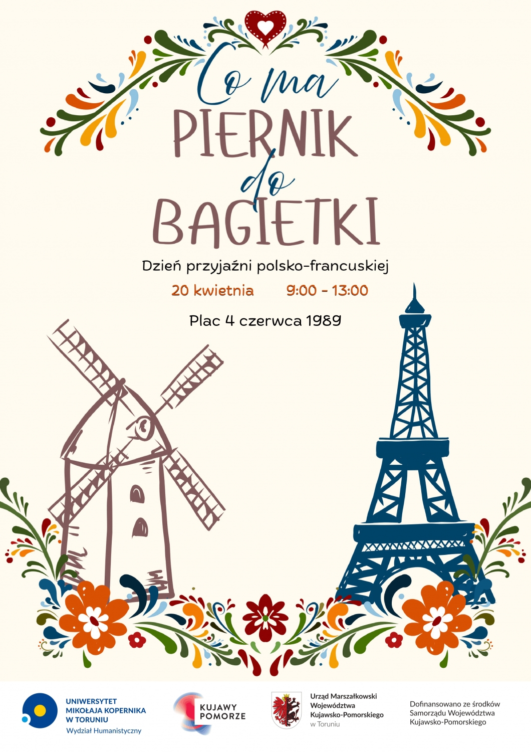 Toruń i Paryż mają ze sobą więcej wspólnego, niż mogłoby się wydawać! Koło Naukowe Kultury i Języka Francuskiego „Excentrycy” serdecznie zaprasza na wyjątkowy happening miejski Co ma piernik do bagietki? z okazji Dnia Przyjaźni Polsko-Francuskiej.